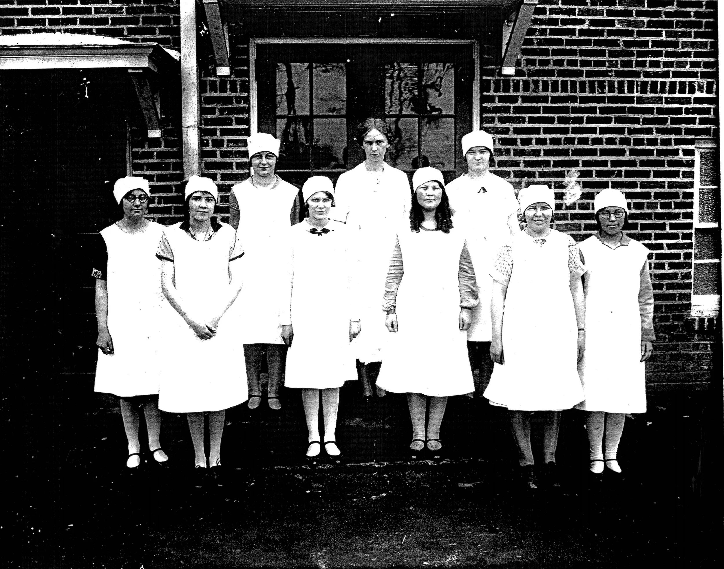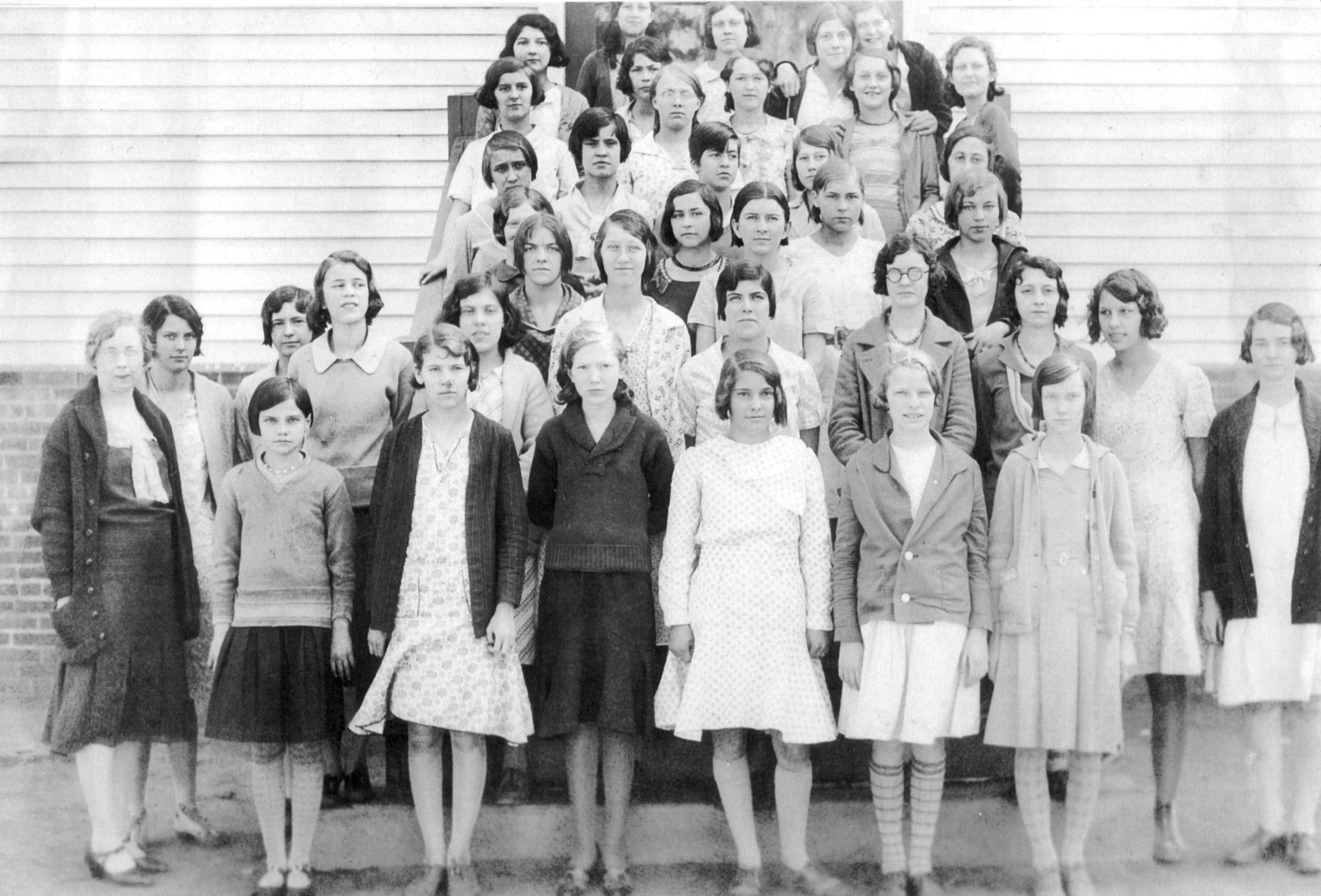 Front Row: Vera Woodie, Unknown, Mary Brewer (Harper), Hazel Kinnaman, Julia Hauser Holder, Bertha Frye Davis Back Row: Elizabeth Burke Brewer, Miss Brim (Teacher), Lucille Lashmit Nelson