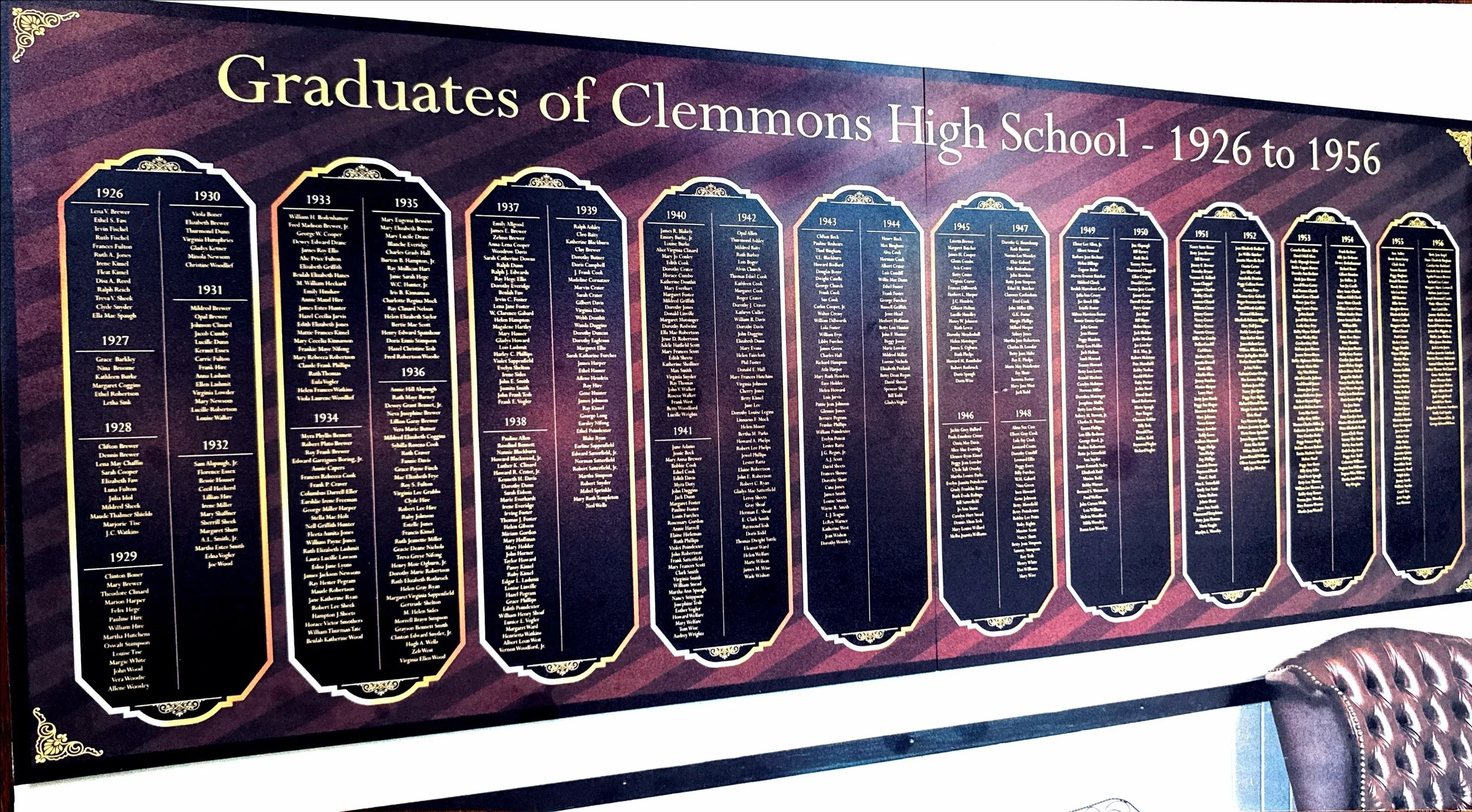 The Historic Broyhill Building features a thoughtfully curated exhibit created by alumni, celebrating the 55 years that the Old Clemmons School served the community. This exhibit includes a remarkable collection of memorabilia—donated by former students and faculty—offering visitors a window into the school’s rich history. Located in the East Wing, the Memorabilia Cabinet and accompanying wall displays showcase the spirit and legacy of the school’s many decades. We hope these displays provide a meaningful glimpse into the years when this building stood as the