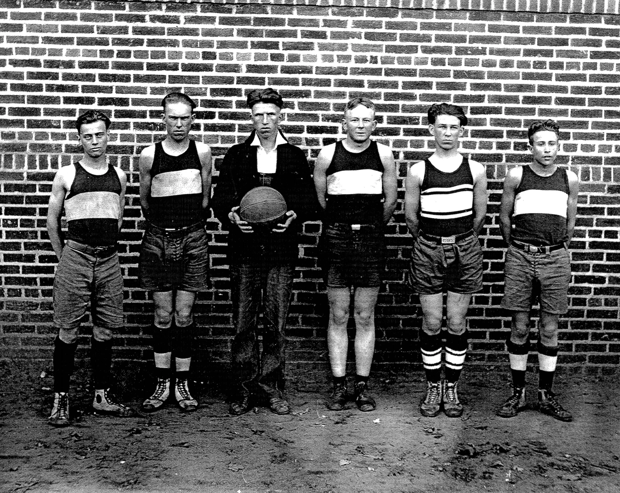 L-R: Dennis Brewer. Back Row: John Craver, Cecil Essex, Coach J.C Killinger, Clifton Brewer, Marion “Bud” Harper. With just five uniforms, the team fielded only five players—and even had to go without socks.